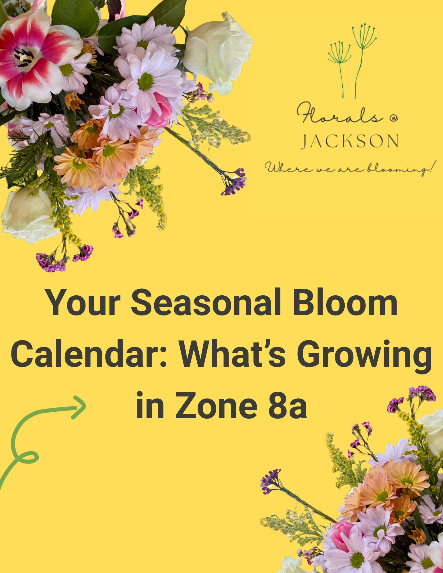 Never miss your favorite flower season again! Get our free printable calendar showing what’s blooming each month in Zone 8a — straight from the fields at Florals@Jackson.